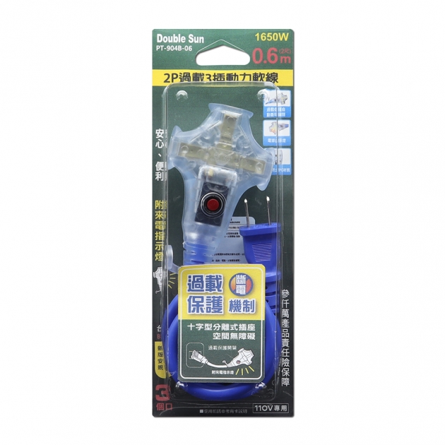(PT-904B-06)2P過載3插動力軟線附燈 0.6米